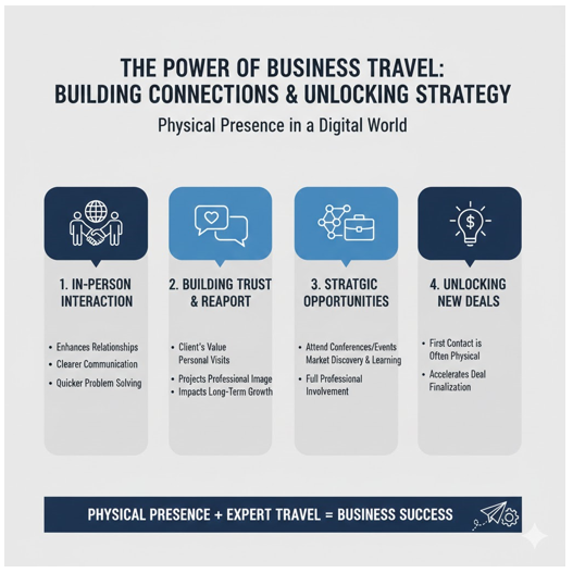 In-person interaction enhances relationships. They help in communicating clearly, more engagement and quicker solutions. Business travel makes these exchanges possible across places.